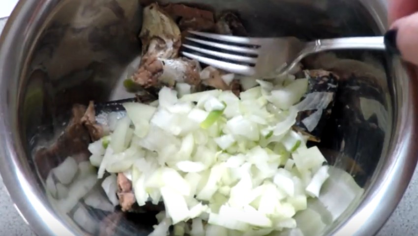 1. Выложите рыбу в глубокую посуду. Нарежьте лук очень мелкими кубиками и добавьте к сайре.