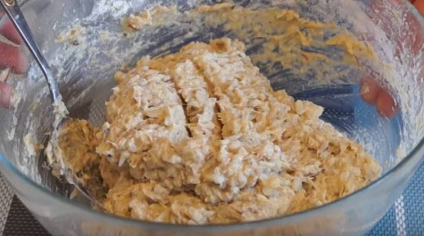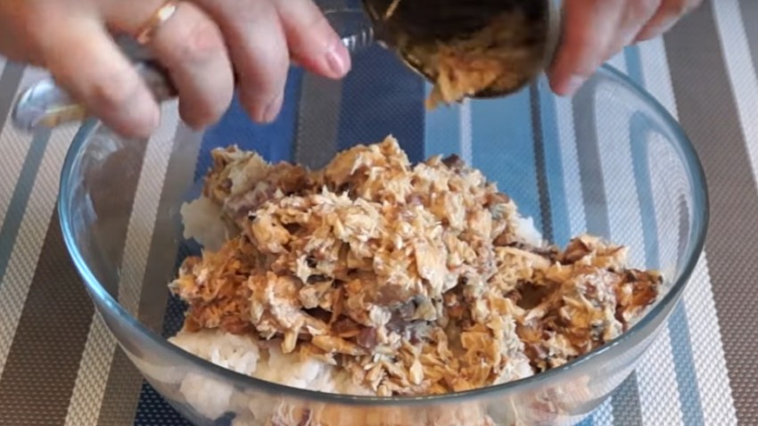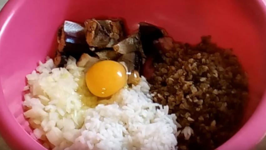 - Зажарку отправляем в охлажденный рис. Открываем консервы, достаем кусочки рыбы и разминаем их вилкой, превращая в пюре. После этого отправляем в основную массу. Кладем соль, перец, муку и тщательно перемешиваем.