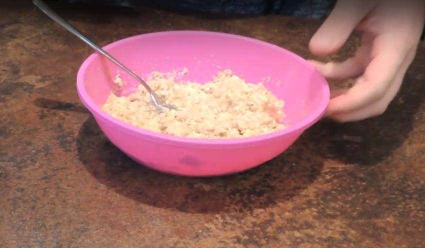 - При помощи вилки или венчика все тщательно перемешать до получения однородной массы.