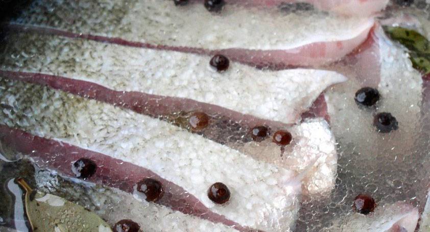 Пока рыба просаливается, готовится уксусный или соляной раствор, из расчета 1 ст. ложка на 1л воды. По истечении 2-х часов, рыба достается из холодильника и помещается в подготовленный раствор на 0,5 часа. Как только пройдет полчаса, рыба достается из рассола и режется на кусочки, после чего они складываются пластами в тару для засолки. Каждый пласт пересыпается приправами, луком, небольшим количеством сахара, а затем все это заполняется растительным маслом. В заключение, рыба плотно накрывается, например, миской с грузом и перемещается опять в холодильник на 6 часов. Через 6 часов мясо рыбы можно принимать в пищу.