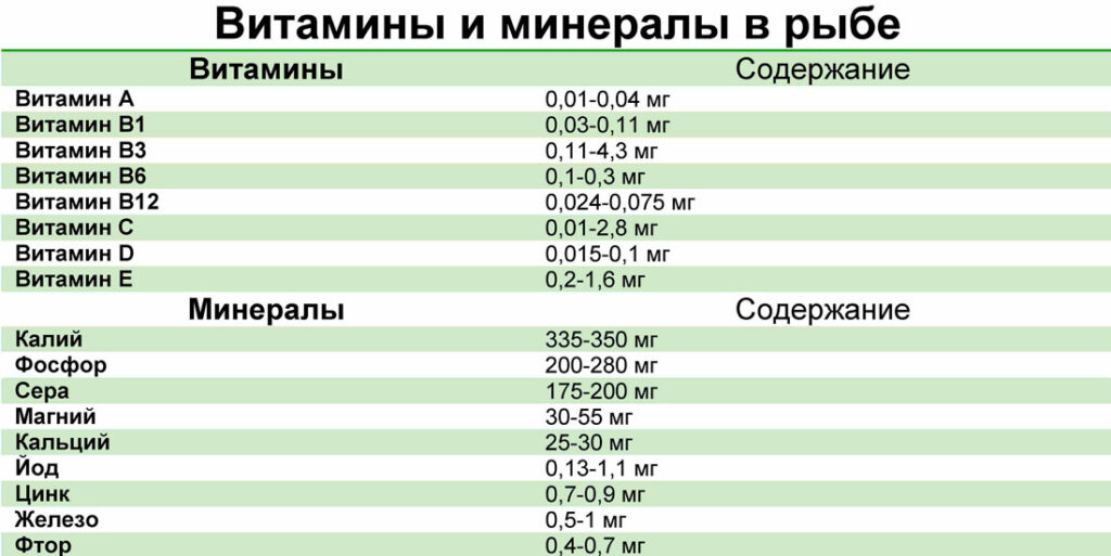 В рыбе содержатся жирорастворимые витамины A, D, E, а также витамины группы В. Есть некоторое количество витамина С, но нужно учитывать, что этот витамин разрушается при термической обработке. Из минеральных веществ в рыбе много калия, фосфора, магния, кальция, йода и фтора.