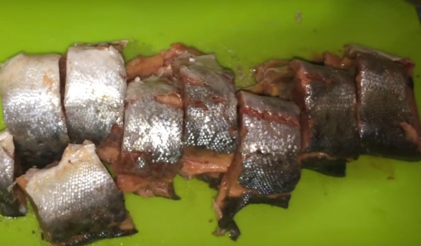 1. Горбушу очистите от внутренностей и плавников. Разделите на порционные куски.