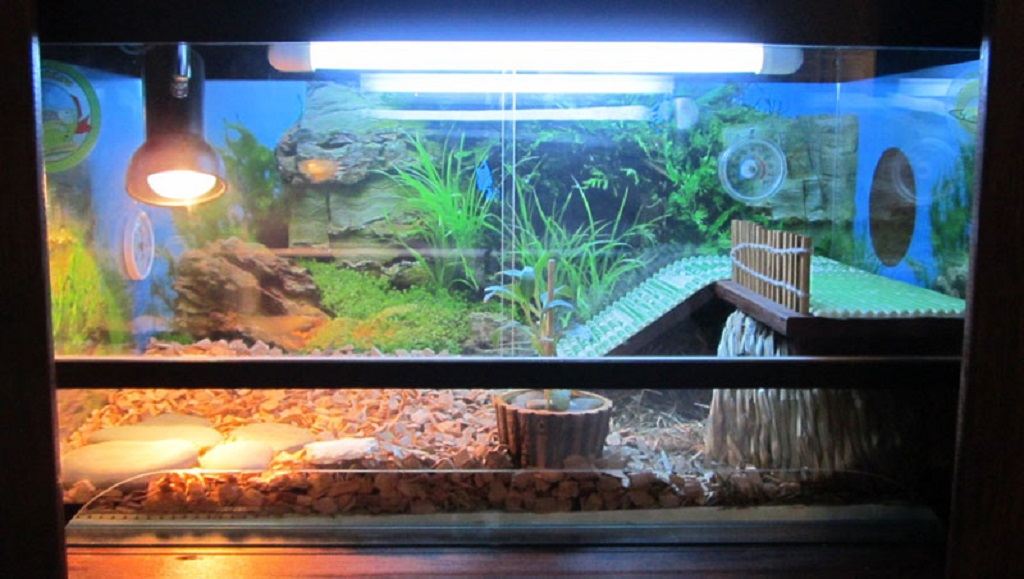 Красноушка – земноводное животное, и поэтому необходимо обустроить аквариум для красноухих черепах так, чтобы 1/3 аквариума занимала суша. Это должен быть относительно большой аквариум, так как через пару лет она подрастет. Для одной особи нужен объем от 100л. Есть специальные модели с неправильной геометрией, где одна сторона ниже, для их установки требуется специальная подставка.