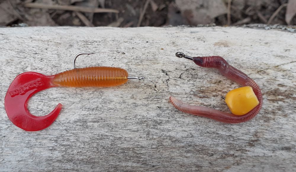 Неоднократно ловили мы на кукурузу и щук. Только поклевки случались не на чистую кукурузу, а на «бутерброды» с червем и опарышем. Механизм привлекающего воздействия на щуку такого сочетания вполне понятен: «бутерброд» имеет большой объем и яркий цвет за счет кукурузы, а шевеление наживки делает его «живым» и привлекательным для хищника. А ведь если внимательно рассмотреть «бутерброд» из одного навозного червя и кукурузы, то он будет иметь определенное сходство с твистером, у которого желтое тело и красный хвостик (фото 8).