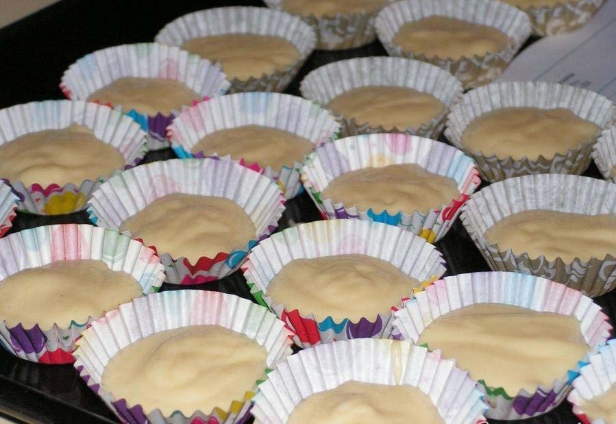 Выкладываем небольшими порциями в формочки, наполняя их до середины, как на фото (в процессе тесто поднимется и займет оставшееся место).