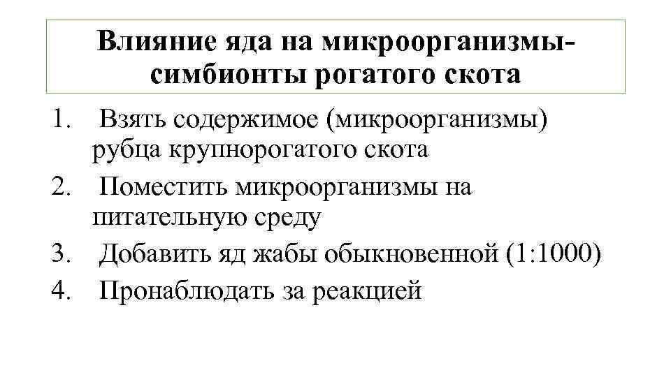 Влияние яда на микроорганизмысимбионты рогатого скота 1. Взять содержимое (микроорганизмы) рубца крупнорогатого скота 2.