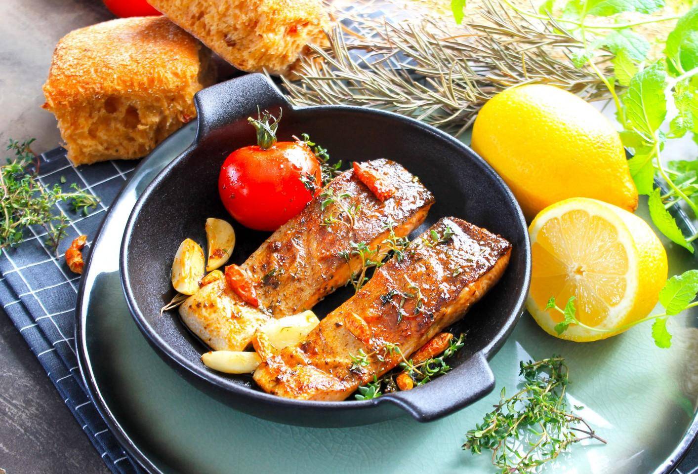 Когда лосось будет готов к жарке, разогреваем сковороду — лучше всего подходит сковородка-гриль или чугунная. Смазываем сковороду маслом и обжариваем рыбу с двух сторон до образования румяной корочки, примерно по 2 минуты, все зависит от размеров и толщины куска.