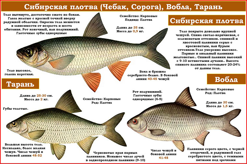 Этот вид рыб еще называют сибирской плотвой. От своих ближайших родственников чебак отличается формой чешуек. На каждой челюсти у него всего по 5-6 глоточных зубов. В боковой линии расположено по 40-45 чешуек. Рыба отличается от своих сородичей расположением спинного плавника и строением пасти.