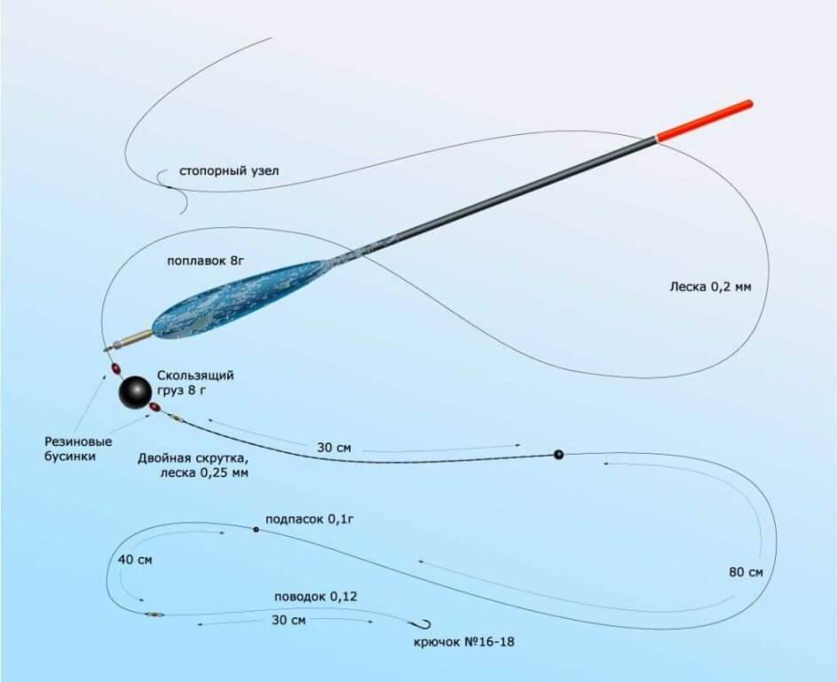 Забросить такую удочку можно примерно на 4 метра и длину выбранной оснастки. Обычно делают самые легкие оснастки с поплавками веса около 1 г.