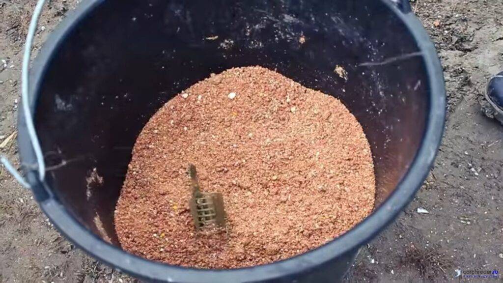 - Перед тем как опустить прикормку в лунки, ее необходимо смешать с кормовым мотылем (мотыля следует добавить в количестве 15–20 % от общего объема прикормки).
