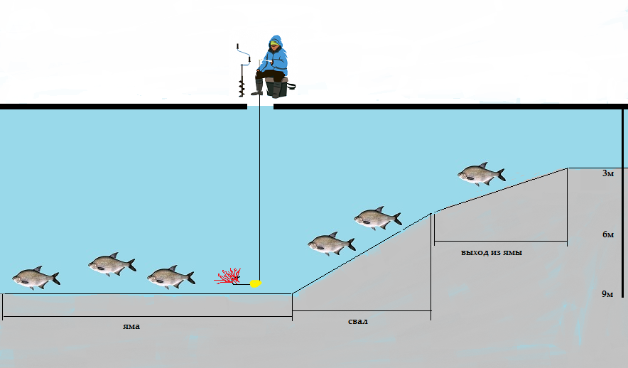 Для начала нужно хорошо изучить глубины озера и выяснить местонахождение локальных ям с нужной глубиной. Основные места обитания и кормёжки леща – это глубины примерно от 6 до 12 метров. Стоит отметить, что заниматься такой ловлей лучше на более-менее знакомом водоёме, хотя бы по летним рыбалкам. Либо с грамотным напарником, который покажет не только места, но и тонкости подобной ловли.