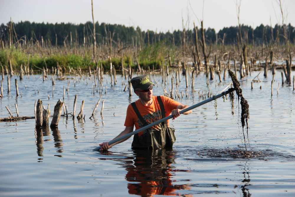 Иногда приходится заранее очищать место ловли линя от растительности