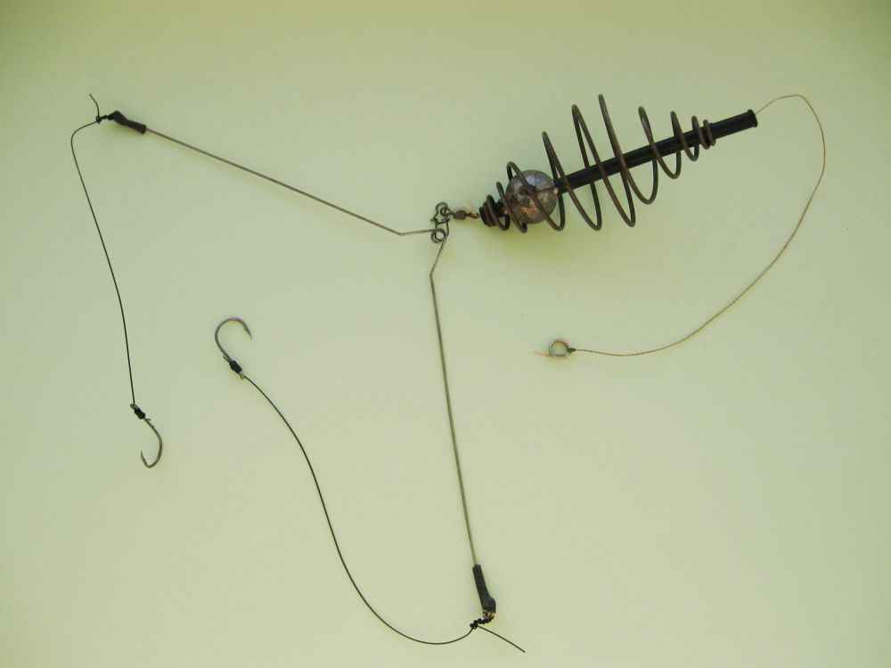 В качестве оснастки я применяю «коромысло» с двумя поводками и карповыми крючками. Для ловли ночью ставлю на поводки фидерную черную леску. Эта леска более прочна, чем такая же по диаметру, но из флюрокарбона, а для дневной рыбалки нет ничего лучше прозрачной флюрокарбоновой лески. Такие поводки не видны на дне при любой освещённости.