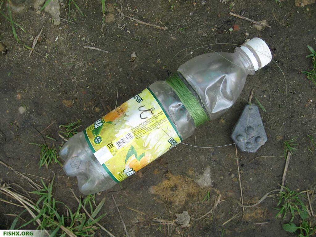 Момент поклевки определяется по движению бутылки на поверхности водоема. За бутылкой следить не обязательно, ее можно прикрепить к ближайшей крепкой ветке на ночь. Снасть проверяется утром на наличие улова.