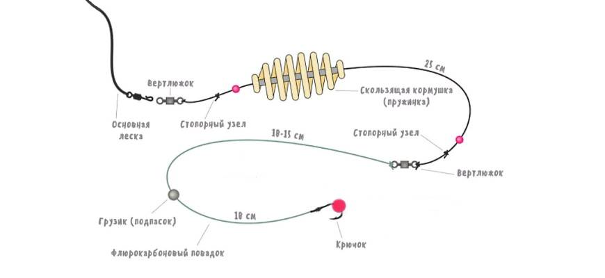 - К скользящей пластиковой бусине, расположенной выше кормушки, привязывается такой же поводок.