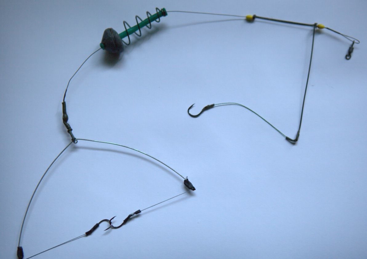 Запас лески на барабане составляет 15-20 м. На основу монтируется скользящее или неподвижное шаровидное грузило. Выше основного груза привязывается отрезок лески длиной 10 см. Место соединения с основной нитью фиксируется тремя свинцовыми дробинками. Они должны быть расположены как можно ближе к основе.Это делается с целью исключения проскакивания грузила в петельку. Количество дробинок колеблется от 2 до 5 шт., что зависит от силы течения. К концу основной лески привязывается двойной вертлюжок. Поводки оснащаются небольшими дробинками, их вес должен удерживать крючок с приманкой на дне