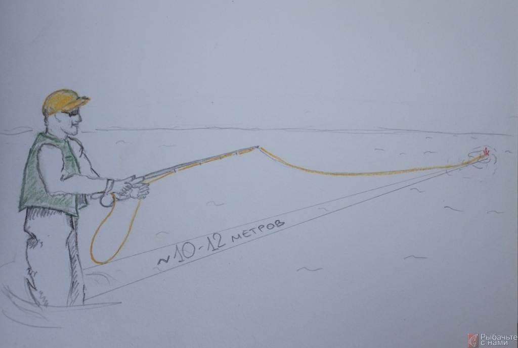 Техника заброса. Техника заброса требует определённых навыков, но вы быстро ей научитесь. Перед забросом, необходимо смотать с катушки около 5-8 метров шнура и пустить приманку по течению, чтобы она полностью утянула за собой смотанный запас шнура. Если Вы ловите на озере без течения, то шнур сматывается взмахами удилища вперёд-назад.