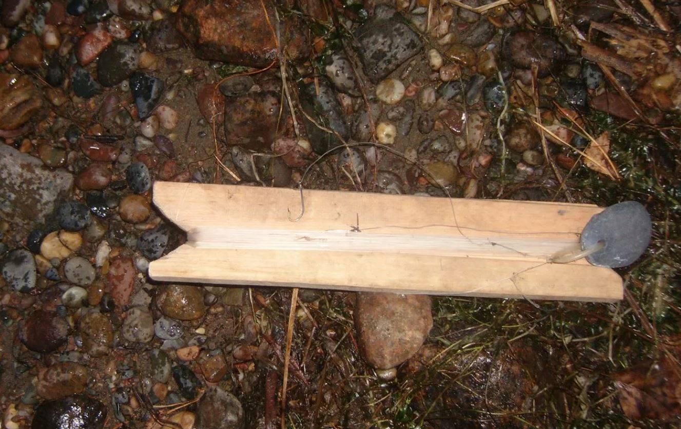 Еще один элемент называется рогатиной. На нее наматывается леска, которая заменяет функции катушек. Деревянную палку нужно держать над лункой, а рогатина должна быть в воде. Рогатину можно привязать к палке при помощи шнура или проволоки за один конец.