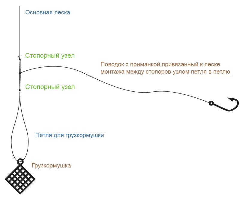 Петля Гарднера представляет из себя основную леску с приманкой, от которой отходит поводок с грузкормушкой. Как правило, основная леска должна быть большего диаметра (0,2 – 0,3 мм), а второстепенная не более 0,2 мм.