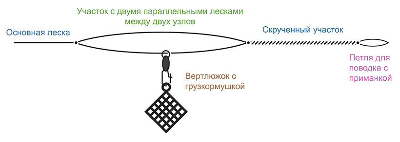 В данном случае также возле оконечной петли для поводка с приманкой есть участок скрученной лески. Он создаёт жёсткую форму, которая не позволяет поводку путаться с леской оснастки. Длина этого скрученного участка примерно 15 см, который фиксируется обычным узлом восьмёрка.