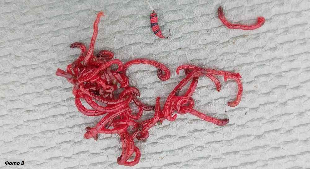 По причине недостаточной тяжести меня не совсем устраивали любимые мною универсальные мормышки-«проволочки», имитирующие бокоплавов. Однако, не сомневаясь в перспективности их использования для ловли лещей, я заказал приманки этой формы у мастеров. Правда, с дополнительной намоткой еще одного ряда вольфрамовой проволоки. Плюс их выкрасили в красный цвет, имитирующий мотыля (фото 8). В результате мои ожидания оправдались – лещи и подлещики здорово ловятся на такую приманку.