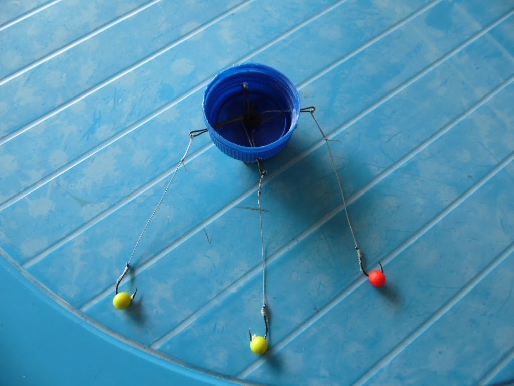 - Способ №1. Берётся основная леска, к которой закрепляется кормушка. От неё идут вниз два поводка с противозакручивателем. Расстояние от них до кормушки – буквально стопорная бусинка. Сверху ещё один поводок. Получается, что рыбачить будете сразу на 3 крючка. Делать длинные поводки не надо, иначе прикормка и насадка в виде шариков пенопласта будут находиться далеко друг от друга.
