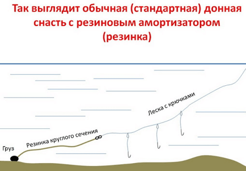Оснащение донки резиновым амортизатором позволяет избежать потерю живца во время забрасывания снасти. Отличие ловли на резинку заключается в натяжении амортизатора, который соединён с грузом, лежащим на дне. Благодаря этому амортизатору рабочий отрезок лески с крючками опускается на глубину.