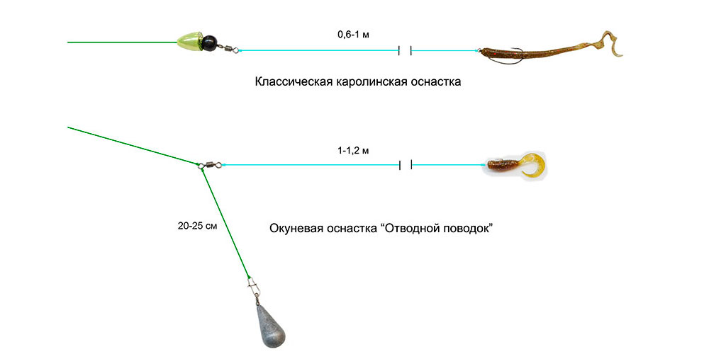 - каролинская оснастка. Придаёт хорошую подвижность наживки, но имеет высокий риск зацепов, используется лишь на относительно чистом дне;