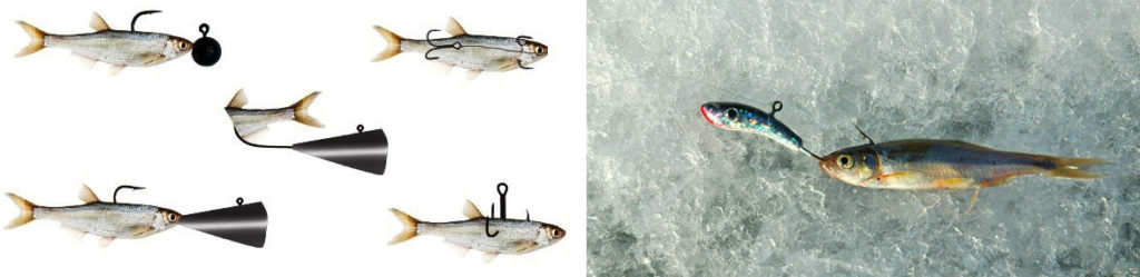 - Один из самых эффективных способов это завести крючок через глаз и вывести в районе спины. Вариант просто проколоть голову через глаза, довольно ненадежный, поскольку тюлька хрупкая и нередко слетает с крючка, особенно на интенсивном течении.