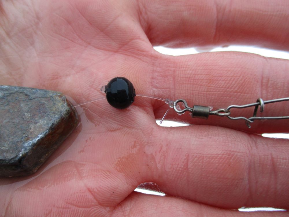 Так как судак хватает приманку только со дна, оснастку необходимо «притопить». Для этого на донку монтируется скользящее грузило весом 30 — 40 г за последней бусинкой. Крепление резинки. К концу основной лески привязывается крупный вертлюжок. На рыболовной резинке диаметром 0,6 мм делается петля, при помощи которой производится монтаж к вертлюжку. Второй конец резинки привязывается к капроновому шнуру с тяжелым грузом.