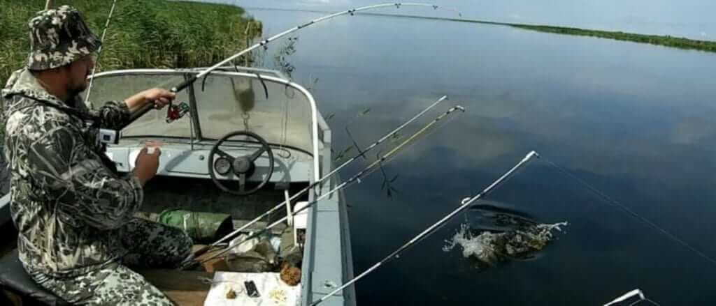 Если на одном из удилищ происходит поклевка, надо остановить лодку и сделать подсечку. После этого следует вымотать остальные снасти, чтобы избежать запутывания оснасток, и приступать к вываживанию.