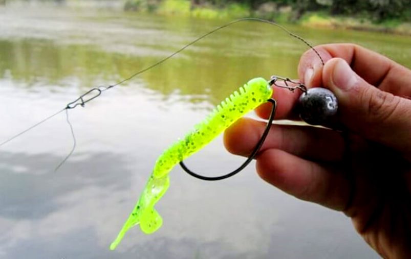 Другой вариант — ловля на стационарную снасть. В этом случае привязанное к концу лески грузило опускают на дно, а поводок с крючком крепят выше него. Такая оснастка подойдет для ловли на реке, ее не будет сносить течением.