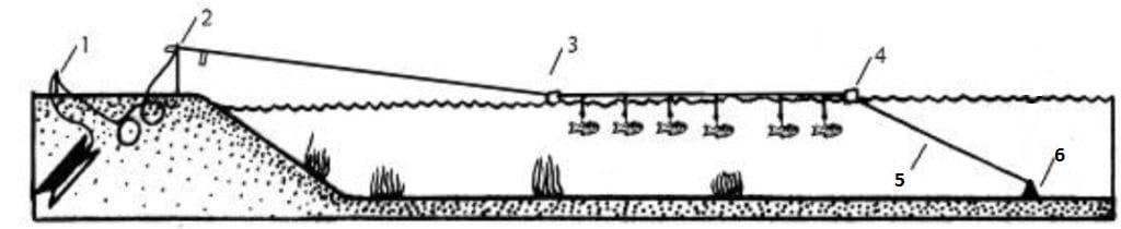 Забросив свою снасть в воду живцов начинает атаковать щука. Заглотив его леска слетит с расщепления, размотавшись уже никуда не денется (привязана к колышку 1). Поплавки держат конструкцию на плаву, а грузило позволяет оставаться снастям на одном месте.Амортизатор советуем ставить с хорошими показателями на разрыв, во время подсечки высокая нагрузка.