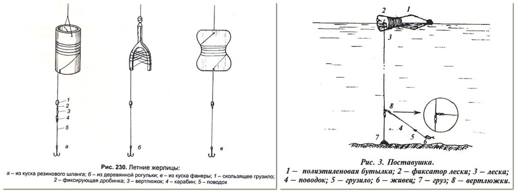 Летняя жерлица чуть сложнее по устройству чем поставушка. Она имеет специальное мотовило, способное сбрасывать леску после поклевки щуки. Хотя, особых различий между жерлицами и поставушками нет. Есть лишь множество различных конструкций.
