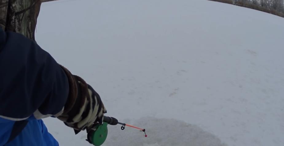 После этого выбирают ледяную крошку и затем досверливают отверстие. После того, как лёд будет просверлен полностью, имеющуюся ледяную крошку необходимо насыпать в лунку. Таким образом, отверстие будет затенено и яркий солнечный свет не будет отпугивать рыбу.