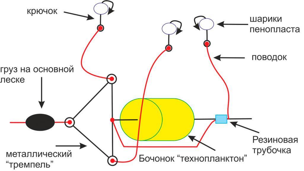 Главная составляющая снасти для ловли толстолобика на техноплангтон с поплавком – тремпель. Это прямоугольная рамка с дополнительными ушками: на одно прикрепляется основная рабочая леса, на другие подвешиваются поводки с крючками. Материалы исполнения тремпеля – проволока сечением 5-6 мм или твердая пластмасса.