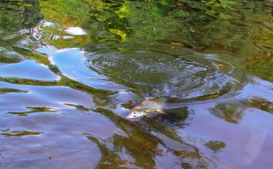 В жаркий период хищник часто останавливается на границе течения с высунутой пастью. Точный заброс поможет получить мгновенную поклевку.