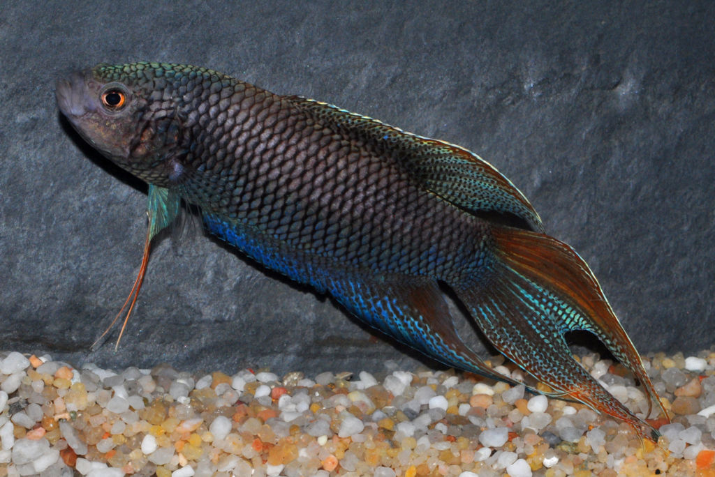 Нерест: он обвивается вокруг ее брюшка и выдавливает из нее икру. И так несколько раз. Когда необходимое количество икры достигнуто (в районе 500-1000 штук), самец прогоняет самку и подбирает не попавшие в него икринки. Самец будет рьяно охранять гнездо, пока мальки не вылупятся. Он становится более агрессивным и опасным. Если самку вовремя не забрать из нерестовика, то она может получить повреждения или погибнуть.