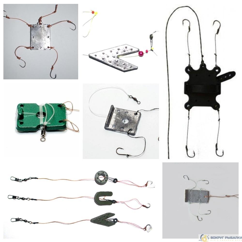 Если груз крепится вглухую, то есть, неподвижно, то он должен иметь специальную форму (плоскую или типа «ласточкин хвост»). При креплении брикета, он, как правило, плотно прилегает к грузилу. Для крепления макухи в центре кубика сверлится отверстие, через которое и осуществляется крепеж приманки. Поводки крепятся к концу основной лески с помощью карабина и вертлюжка.