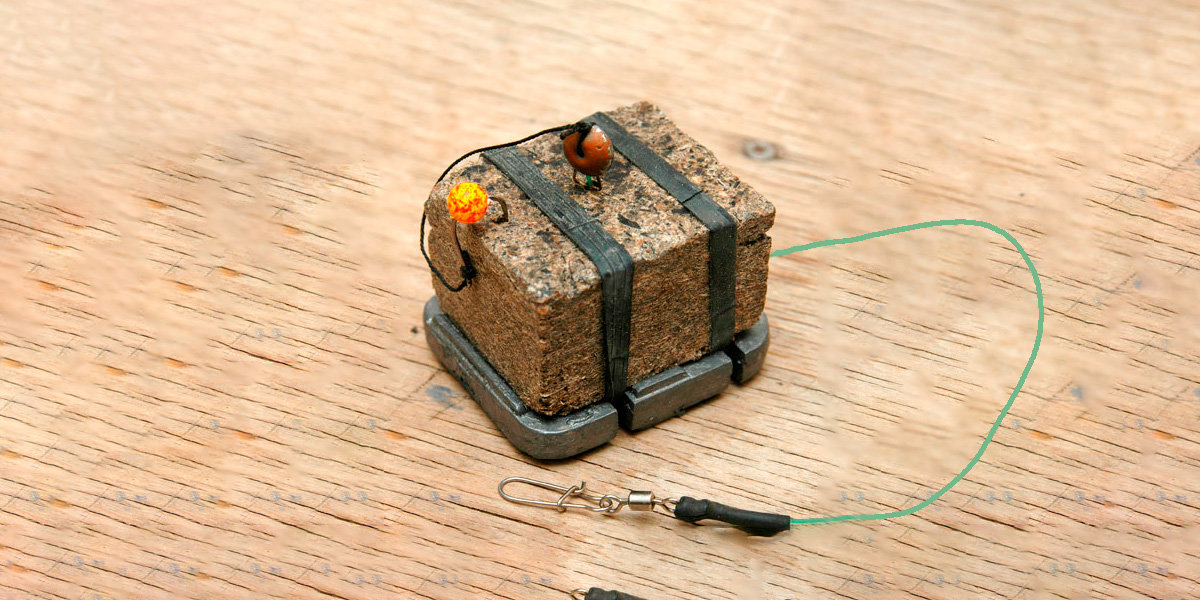 “Макушатник” работает так: вы затягиваете самозатягивающимся узлом кубик жмыха, по краям вставляете в него насколько это возможнокрючки (легче дома заранее просверлить тонким сверлом отверстия), крепите всю оснастку к основной леске через карабин и вертлюг и закидываете в водоем. Так как жмых легче свинцового грузила и находится он сверху его, то после падения на дно, он в любом случае будет находится с верху (полностью исключается возможность закрытия нашей приманки грузилом или проваливание ее в ил).