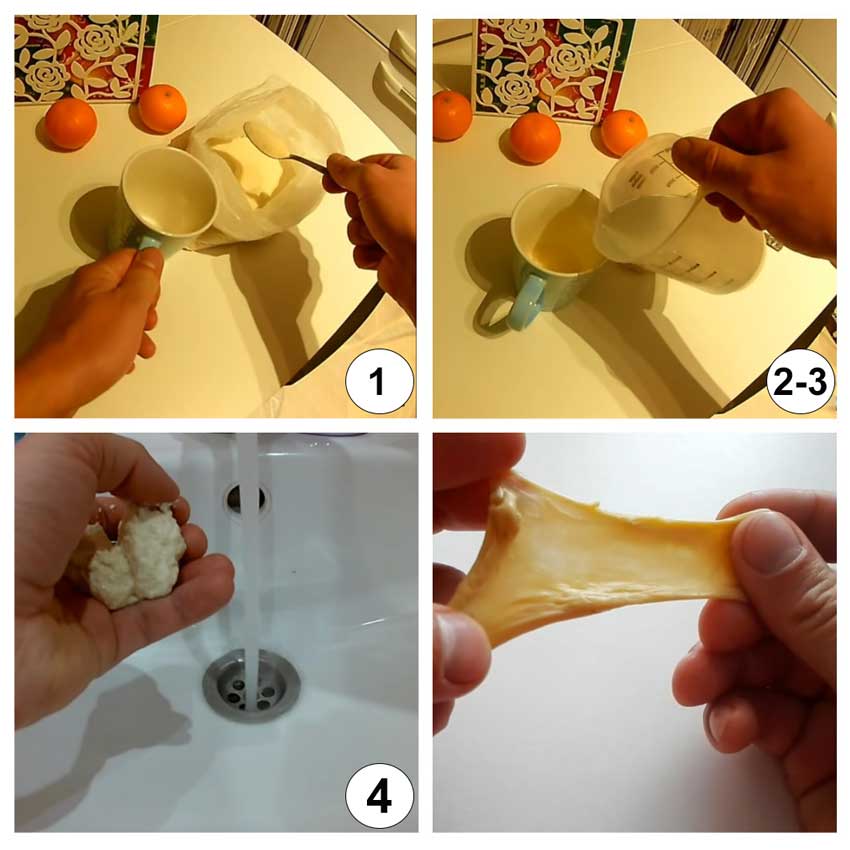Как только смоется белая муть и песочек, так «промытое» тесто готово. Руками вы сразу почувствуете, когда тесто станет как жевательная резинка.