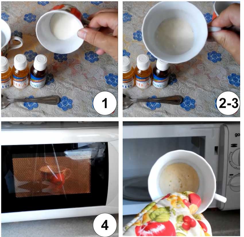 - Засыпаем в кружку манную крупу и заливаем водой — пропорции один к одному (1:1).