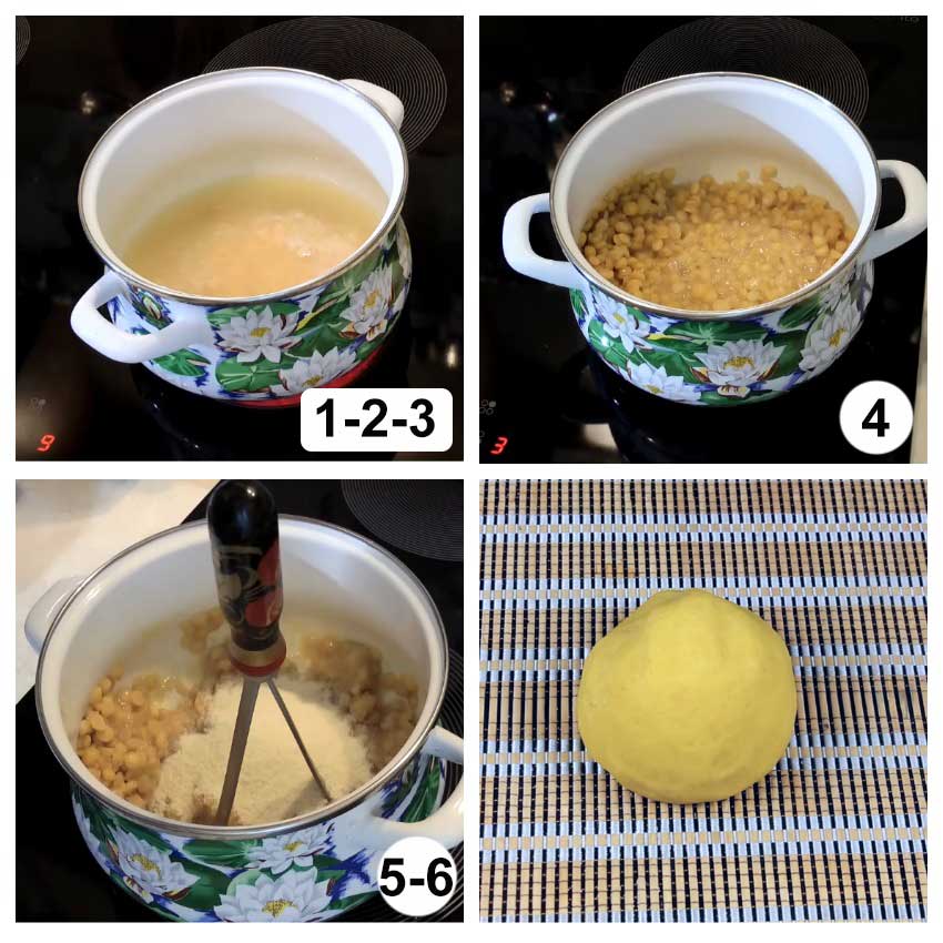 Когда каша перестанет быть обжигающе-горячей, нужно будет добавлять в нее скромными порциями манку, постоянно помешивая мастырку при помощи ложки, до тех пор, пока смесь не станет скатываться в форме шариков. На этом этапе нужно мять это импровизированное тесто руками, добавляя в него манку, пока мастырка не станет напоминать пластилин. Теперь скатываем ее в колобок и обваливаем в манке или пшеничной муке.