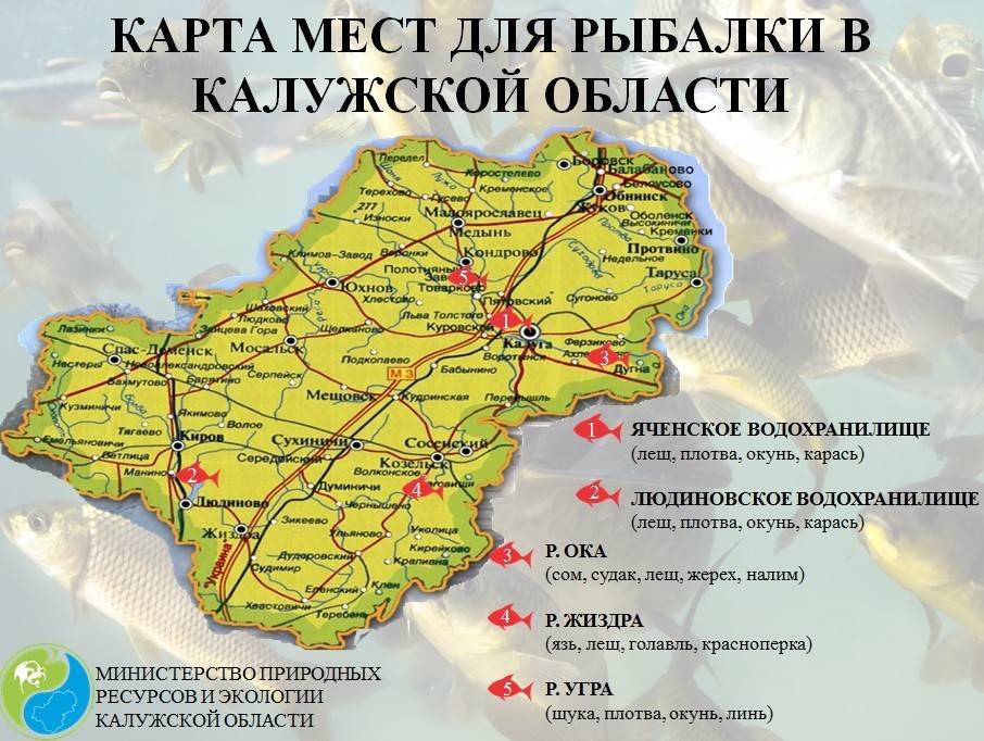 Проточные водоёмы обычно отличаются большим разнообразием видов рыб, в то время как в стоячих могут встречаться редкие, слабо распространённые трофеи. Большинство из них располагаются по Калужскому шоссе, однако перед поездкой стоит ознакомиться с самыми популярными из них более подробно.