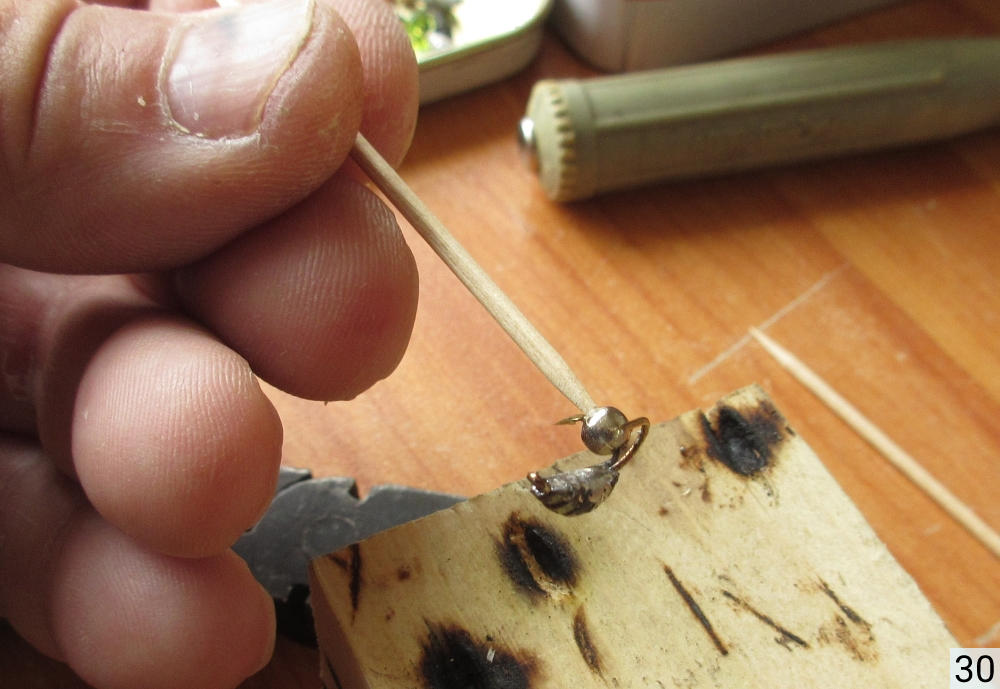 Для повышения прочности пайки цевье крючка можно предварительно обработать, нанеся поперечные риски при помощи абразивного бруска, крупной наждачной бумаги или алмазного надфиля. Вольфрамовую заготовку я укладывал в паз, пропиленный в деревянном бруске, так, чтобы она немного возвышалась над поверхностью. Для удобства фиксации крючка с надетым на него бисером или шариком, использовал обычную зубочистку. Если впаивается крючок без оснащения, его можно зафиксировать на заготовке, воткнув в ушко портняжную булавку или тонкую сталистую проволоку (фото 42).