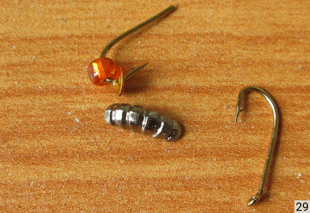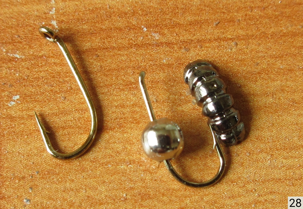 При изготовлении мормышки из одного крючка вполне реально собрать приманку уже с «обвесом». У некоторых образцов бисера и мелких бус, а также набирающих популярность у ладожского окуня металлических шариков, имеются отверстия довольно большого диаметра, через которое легко проходит относительно небольшая петелька крючков №№ 12 и 14, тем самым, заметно упрощая задачу создателю приманок (фото 40).