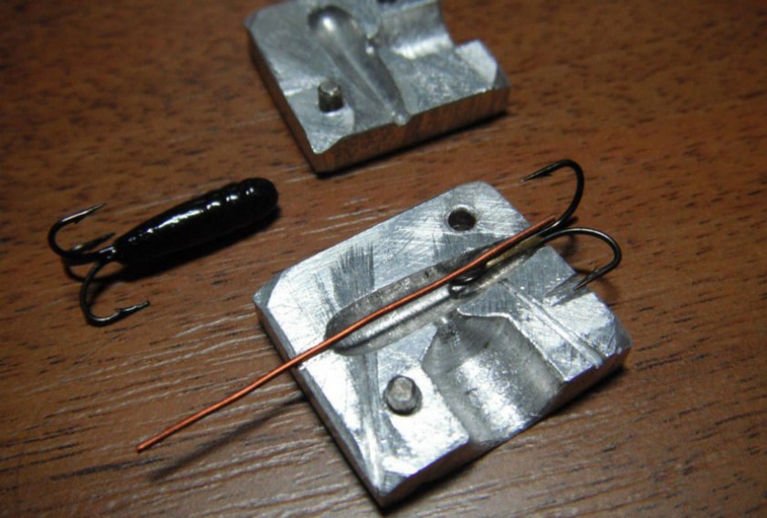 Литьё — один из наиболее трудоёмких способов. Для изготовления снастей таким методом в основном используют свинец, который легко плавится и обладает хорошими прочностными характеристиками. Чтобы создать приманку, сначала изготавливают форму из гипса, состоящую из двух частей. В каждой части нужно будет сформировать оттиск, имеющий такие очертания, которые требуются от конечного изделия. Для этого придётся купить мормышку или одолжить у другого рыбака приглянувшийся вариант. Также нужно сделать оттиск для крючка и небольшую выемку, через которую будет заливаться металл. При объединении двух частей все оттиски должны совпадать.
