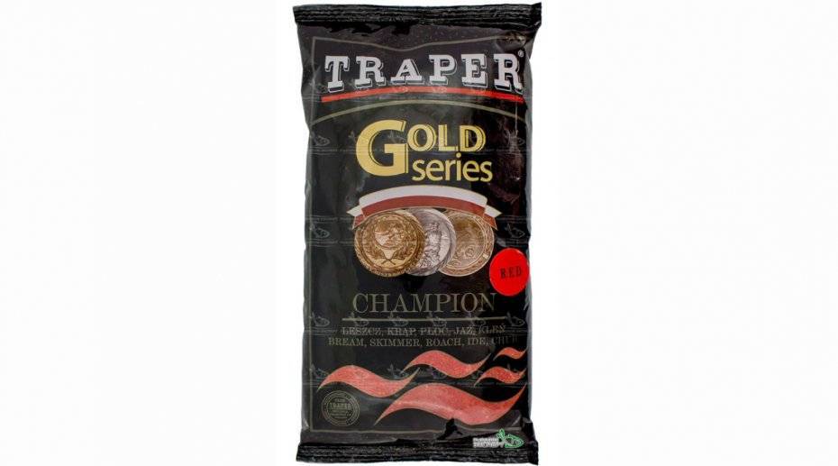 Корм Traper Gold Series Champion, так же являющийся отличной самостоятельной прикормкой, но для ловли леща является базой, нуждающейся в разного рода добавках. Она отлично справляется в условиях сильного течения, несмотря на мелкий помол. В качестве добавок отлично подойдет ароматизаторы клубники, чеснока и гороха. Цвета прикормки немногочисленны: лишь красный и коричневый. Огромным преимуществом является тот факт, что Traper Champion разработан бывалыми рыбаками, знающих свое дело от и до, имеющими множество наград на международных соревнованиях.
