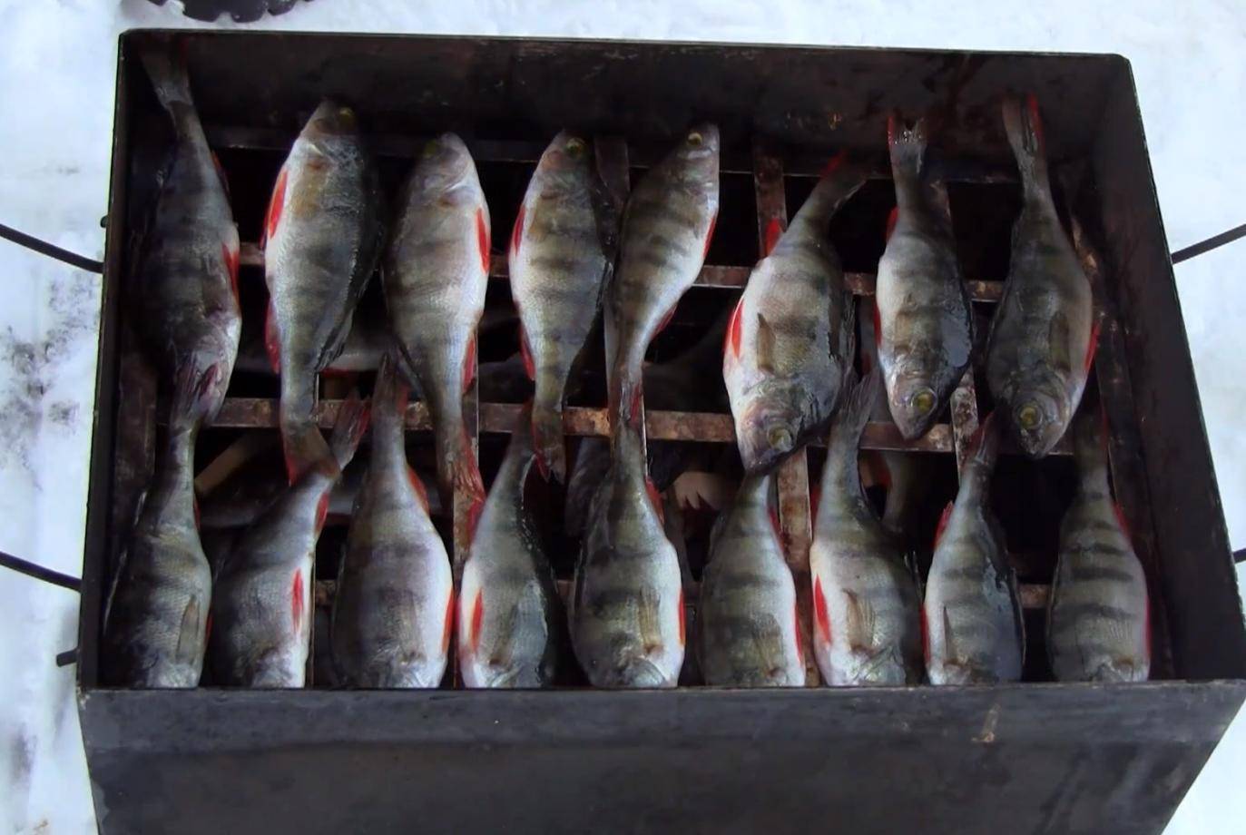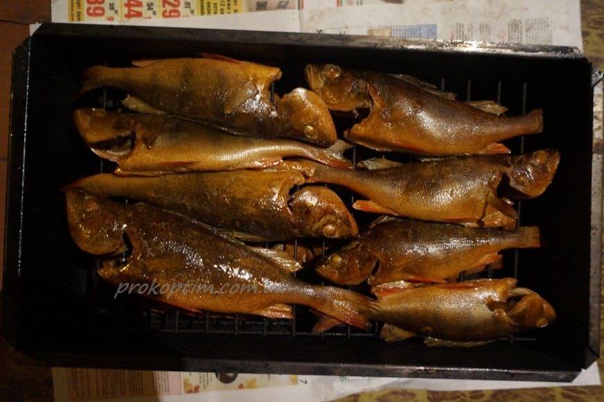 - В первые 6–8 часов поддерживают низкую температуру, чтобы окунь как следует прокоптился внутри.
