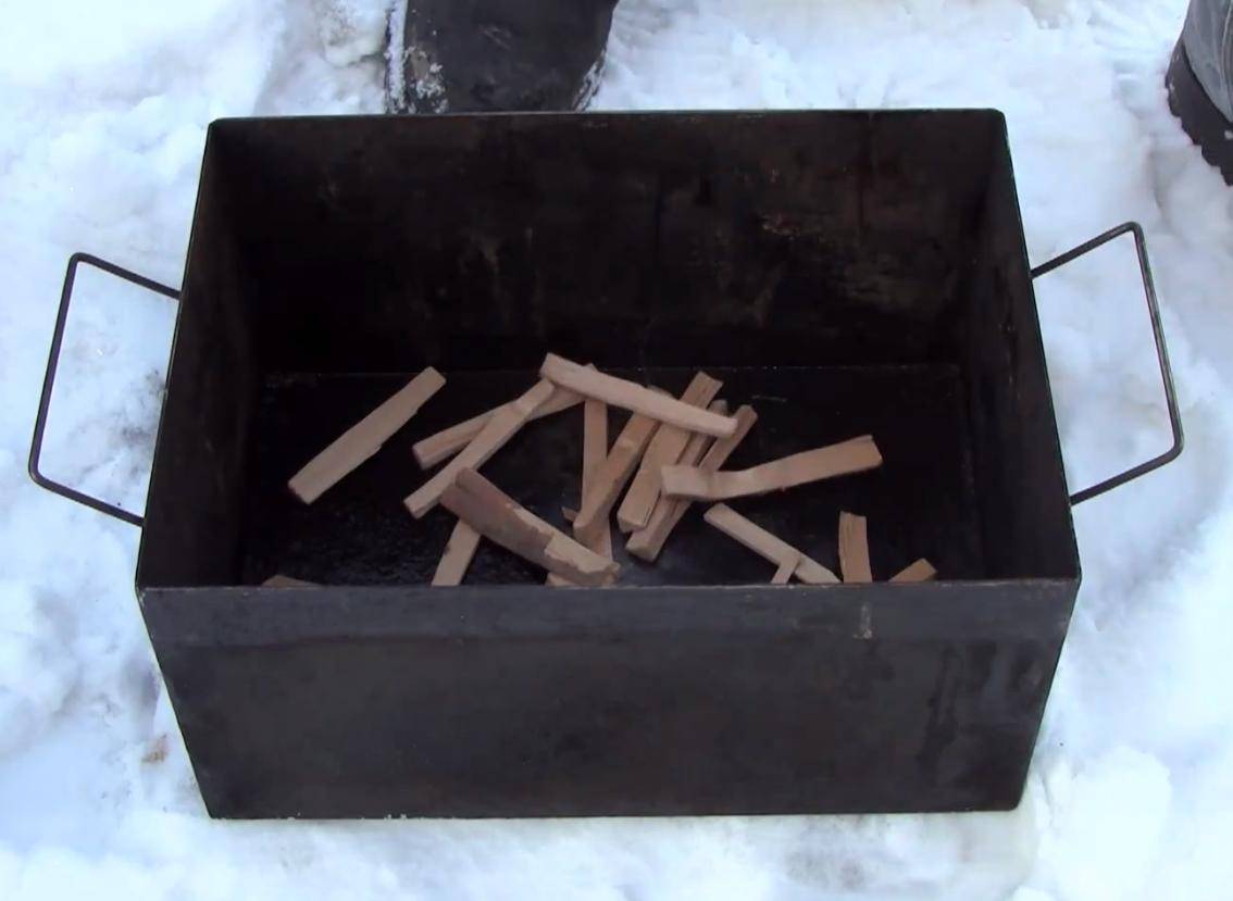 Теперь, когда наш окунь хорошенько промариновался, подготовим нашу установку для копчения и приступим непосредственно к процессу приготовления. Для этого наполняем дно коптилки специально подготовленной щепой или простыми опилками с фруктовых деревьев.